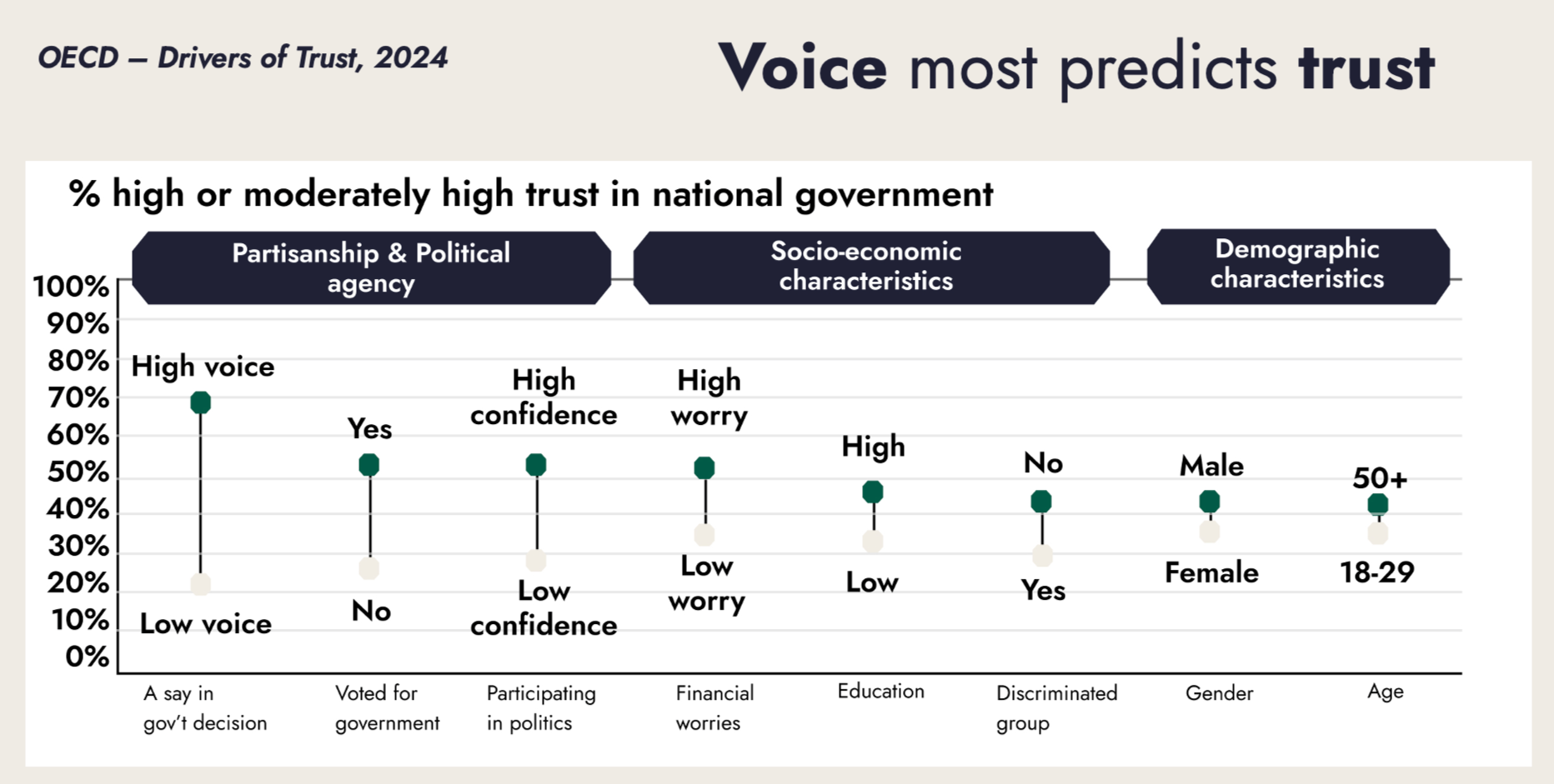Alongside this downward trend, trust has become deeply polarized. Political identity increasingly shapes individual and public perception, and confidence in government shifts dramatically depending on which party holds power. Overall, public confidence in core institutions has steadily eroded, leaving us to wonder what can be done.